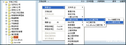 在hnkzdPLM系统中,可便捷地基于模板创建新文档。进入【文档管理】的“工作区”,在目标位置右键选择【新建】。根据需求选择文档类型,例如依次选择【新建】→【三维CAD文档】→【Pro/E三维文档】→【Pro/E零件文档】。